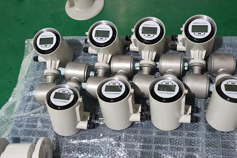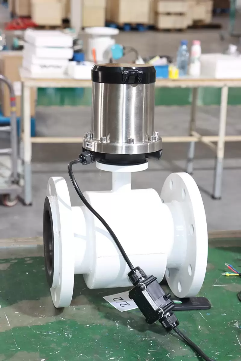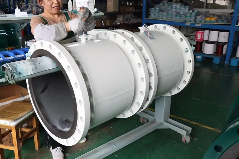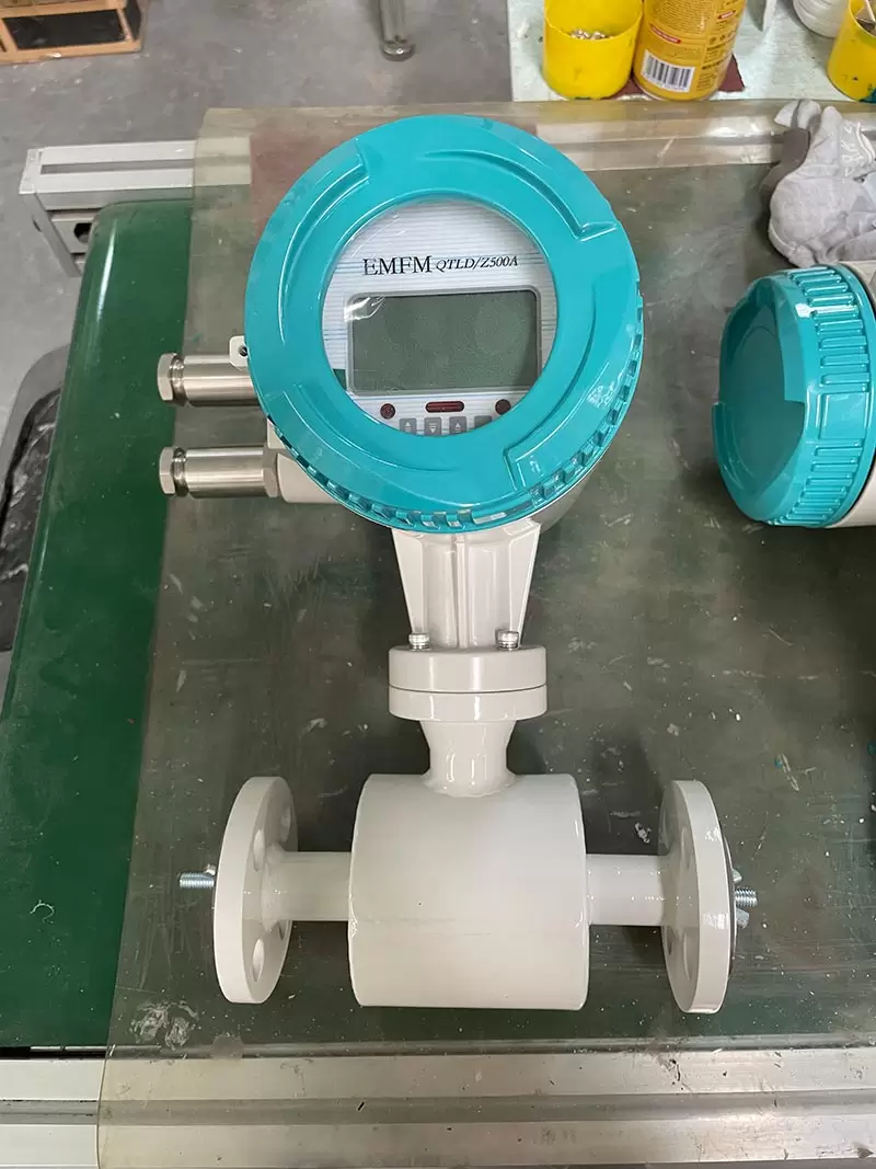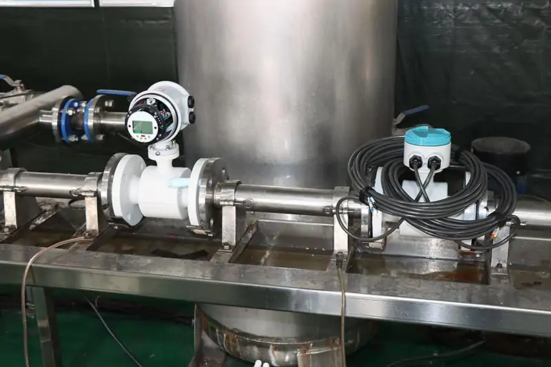 magnetic flowmeter will be tested by pressure equipment. QTLD waste water flow meter is calibrated by ISO/IEC 17025:2016 CNAS Approved liquid flow meter is installed in the chemical plant to measure waste water, the pipe is PVC, so we configure grounding rings to have better grounding to protect the electromagnetic flow meter.