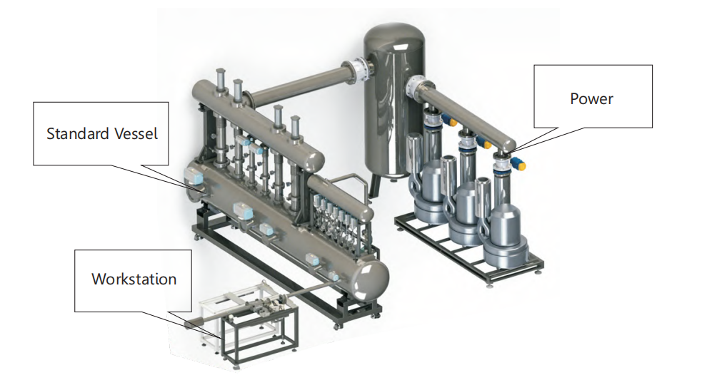 It consists of a stagnation vessel, a large-area vacuum vessel, a small-area vacuum vessel, standard flow meters (Critical Flow Venturi Nozzles), vacuum valves, connecting pipelines, and structural component